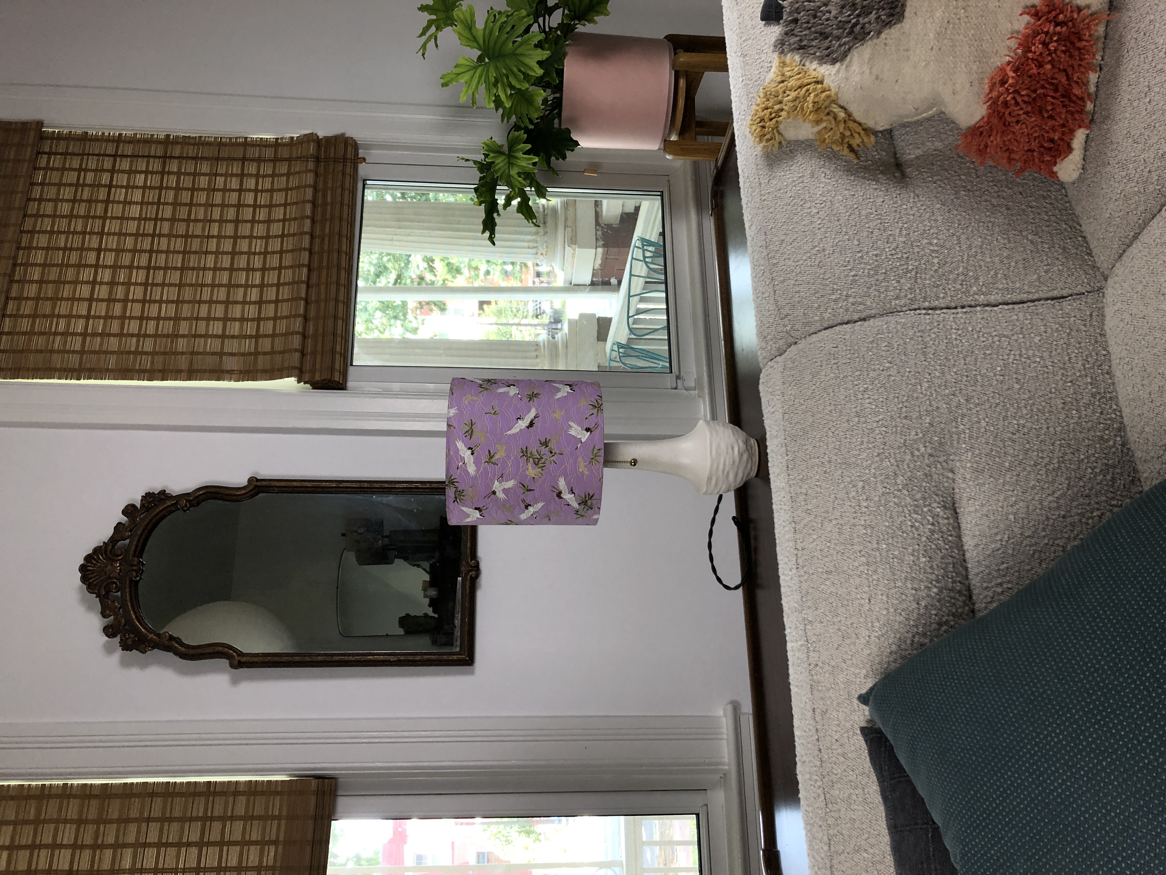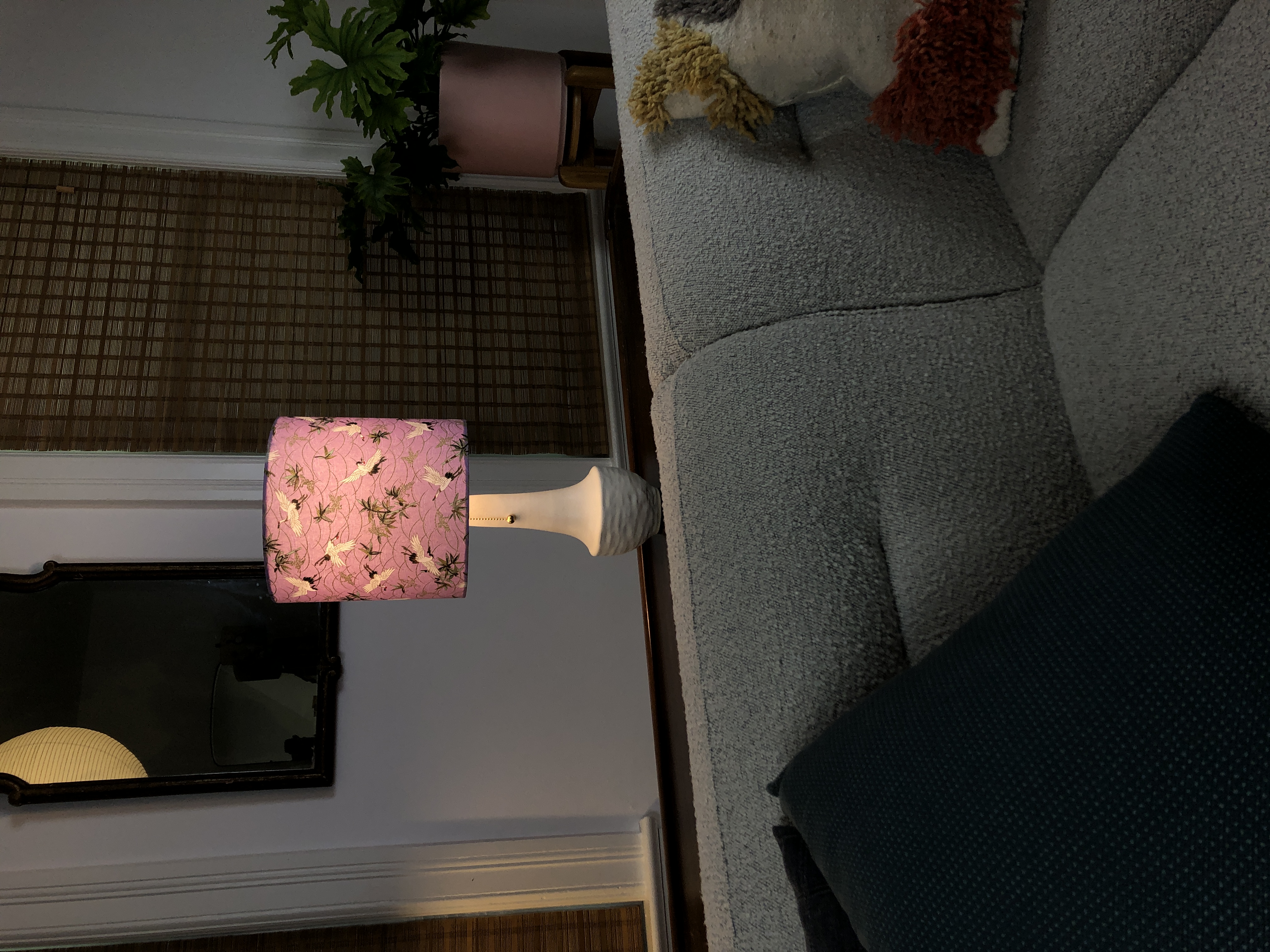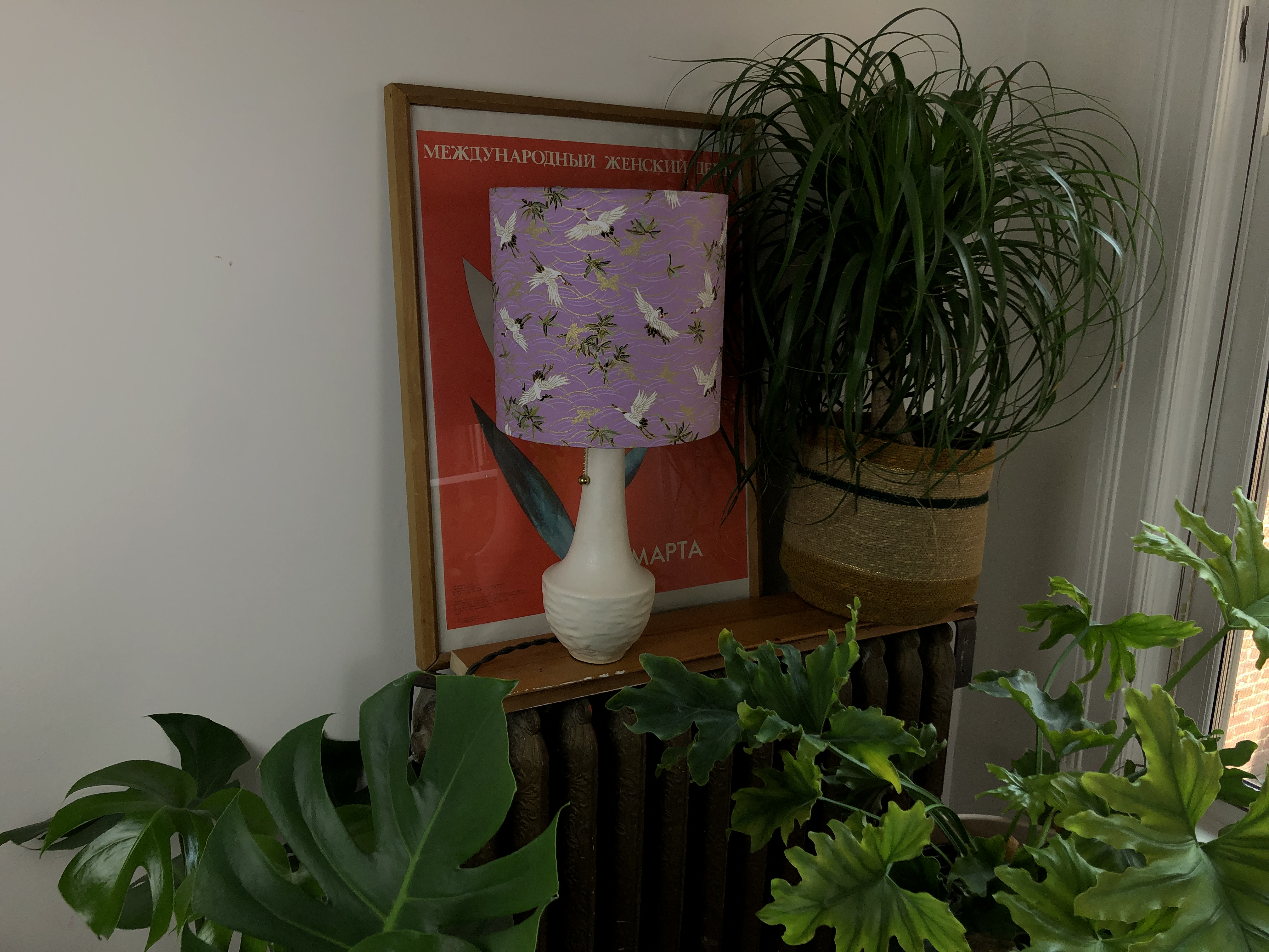The 10in diameter shade was hand-assembled, using imported Japanese cotton fabric, stryene material, and wire frames. The lamp stem, cap, and socket are constructed from unfinished brass, and is powered by a twisted, fabric-covered power cord.